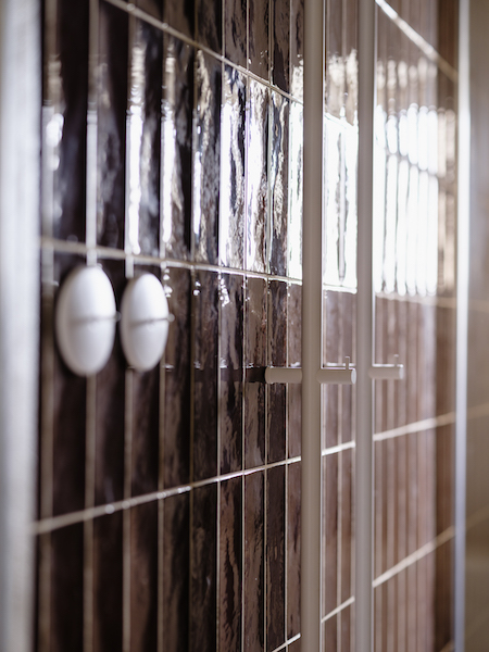 … hormis ce mur de carrelage chocolat brillant qui joue avec la lumière et donne de la verticalité à la pièce, tout comme les deux barres sèche-serviette minimalistes (Instamat).