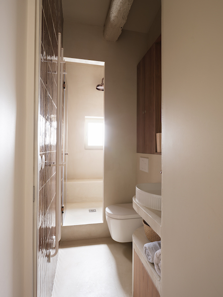 La salle d’eau a pris la place de l’ancienne cuisine. La douche aux dimensions confortables profite pleinement de la luminosité d’une petite fenêtre. Un béton ciré crème habille toute la pièce…