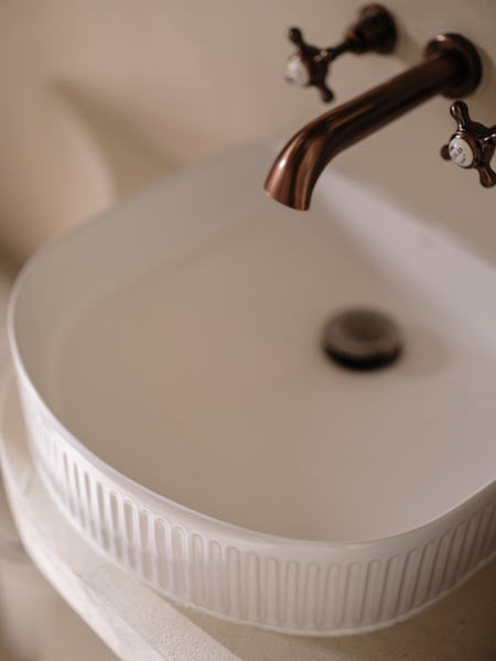 La robinetterie rétro (Hudson Reed), aux teintes sombres, est mise en valeur par le béton ciré beige… et réciproquement ! La vasque (Tots) a été choisie cannelée, pour apporter du relief à l’ensemble.