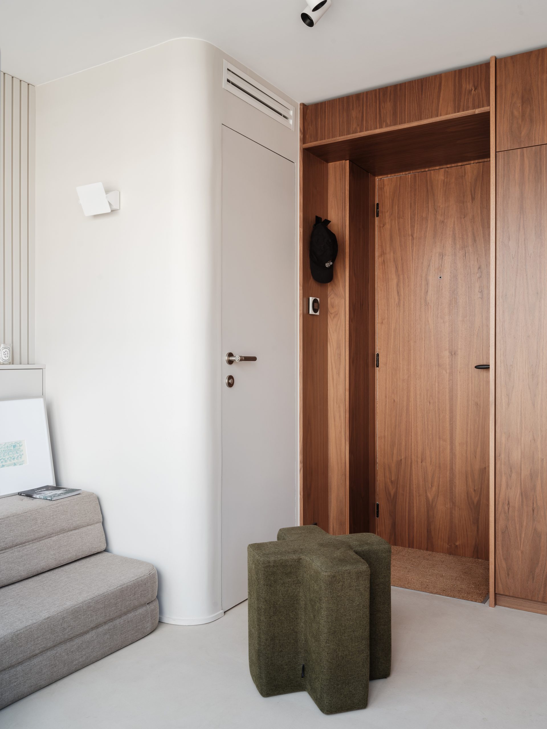 L’entrée est signifiée par le décroché dans la façade en noyer. Une patère accueille casquette et manteaux pour débarrasser les occupants. Dans la colonne à droite de la porte, la box internet est astucieusement dissimulée parmi les autres objets que l’on ne souhaite pas voir.