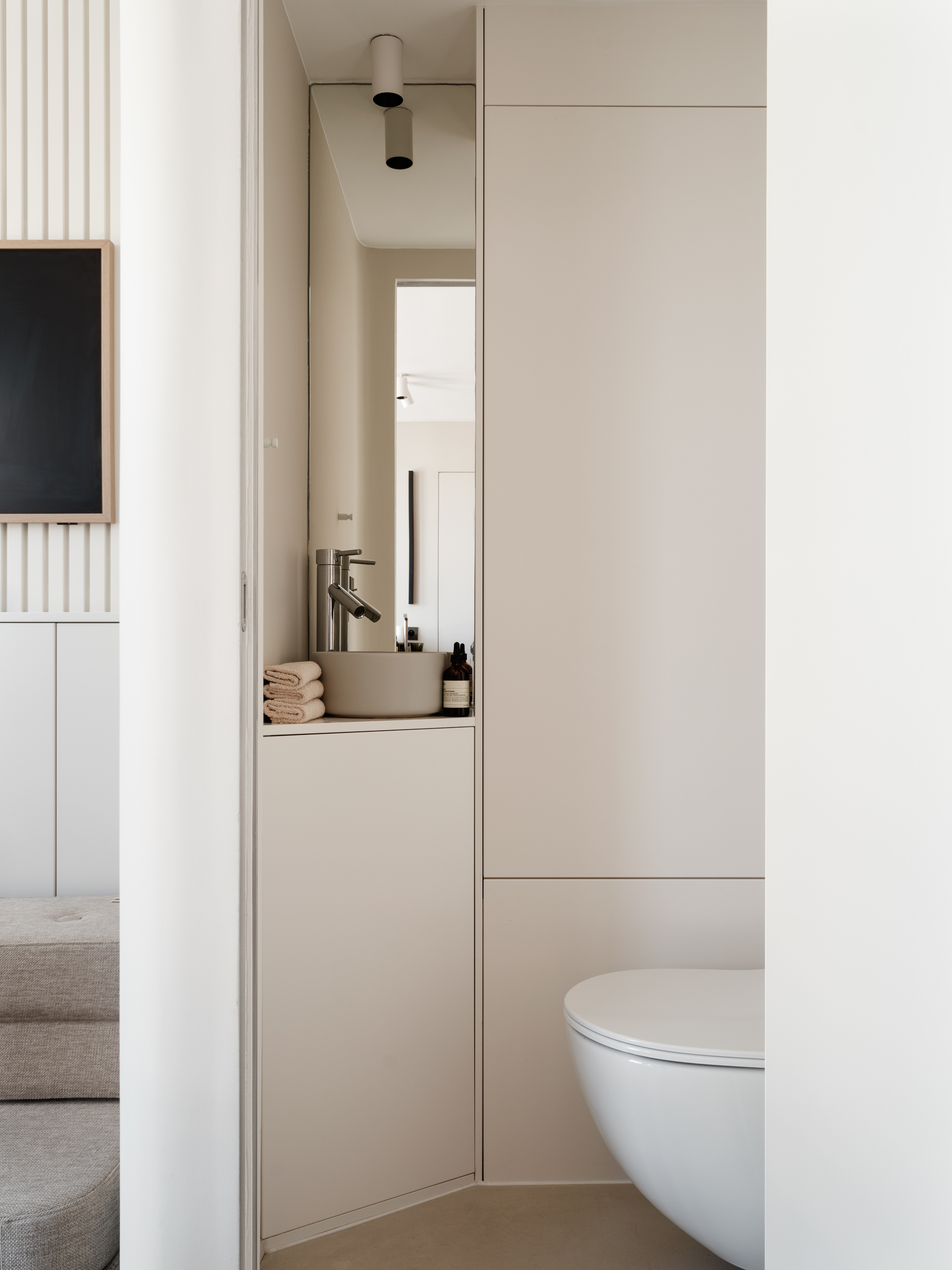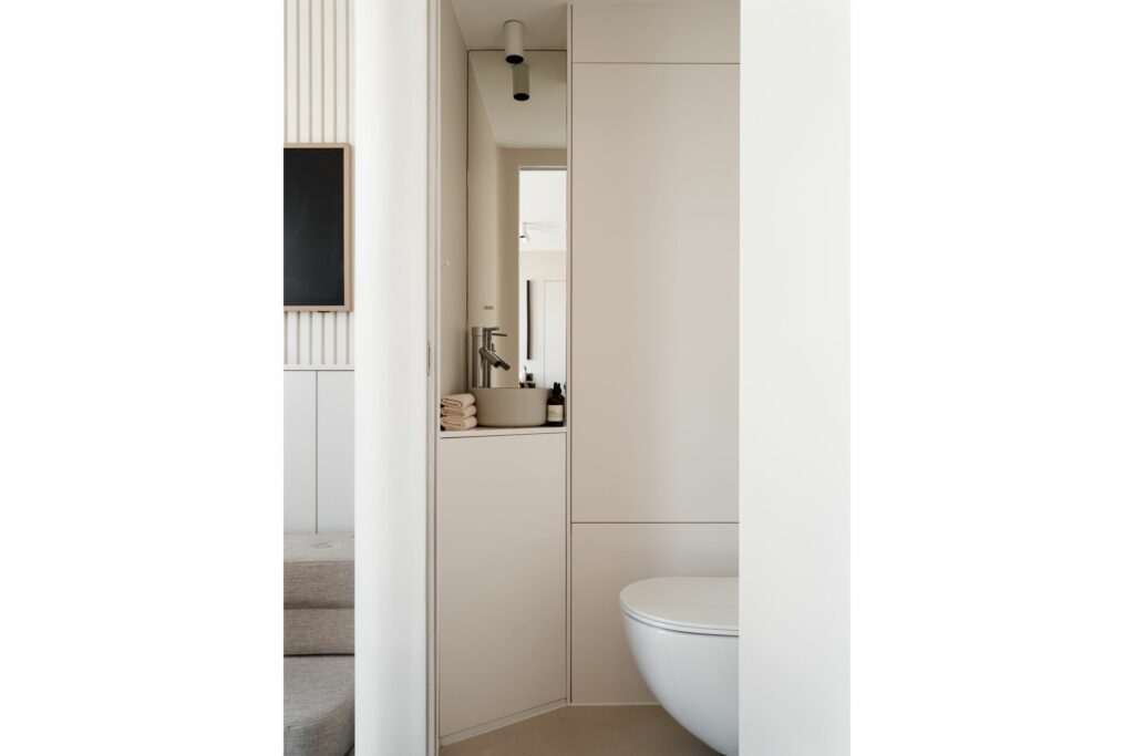 Dans le prolongement, les WC séparés, traités tout en monochrome blanc pour accentuer la sensation d’espace. Au-dessus, un rangement permet de faire place nette et de cacher le ballon d’eau chaude.