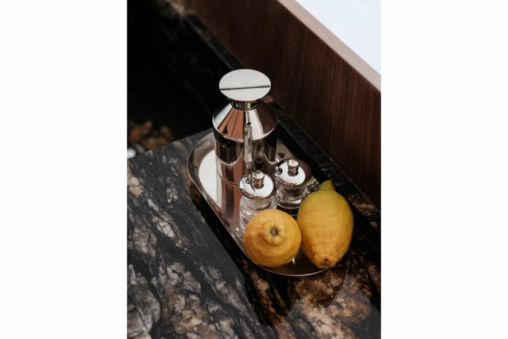 Pour réussir ce tour de force, l’architecte décide de diviser l’espace en deux et de créer une séparation visuelle matérialisée par un îlot de cuisine. Une ligne longitudinale qui crée immédiatement un effet de profondeur. Côté ambiance, il opte pour une inspiration « chambre d’hôtel luxueuse » avec une nuance grège au sol et au mur, réchauffée par le vert de la tête de lit, le noyer du mobilier et le marbre noir de l’îlot central. Un mix de couleurs et matières élégant pour ce petit studio qui a définitivement tout d’un penthouse !