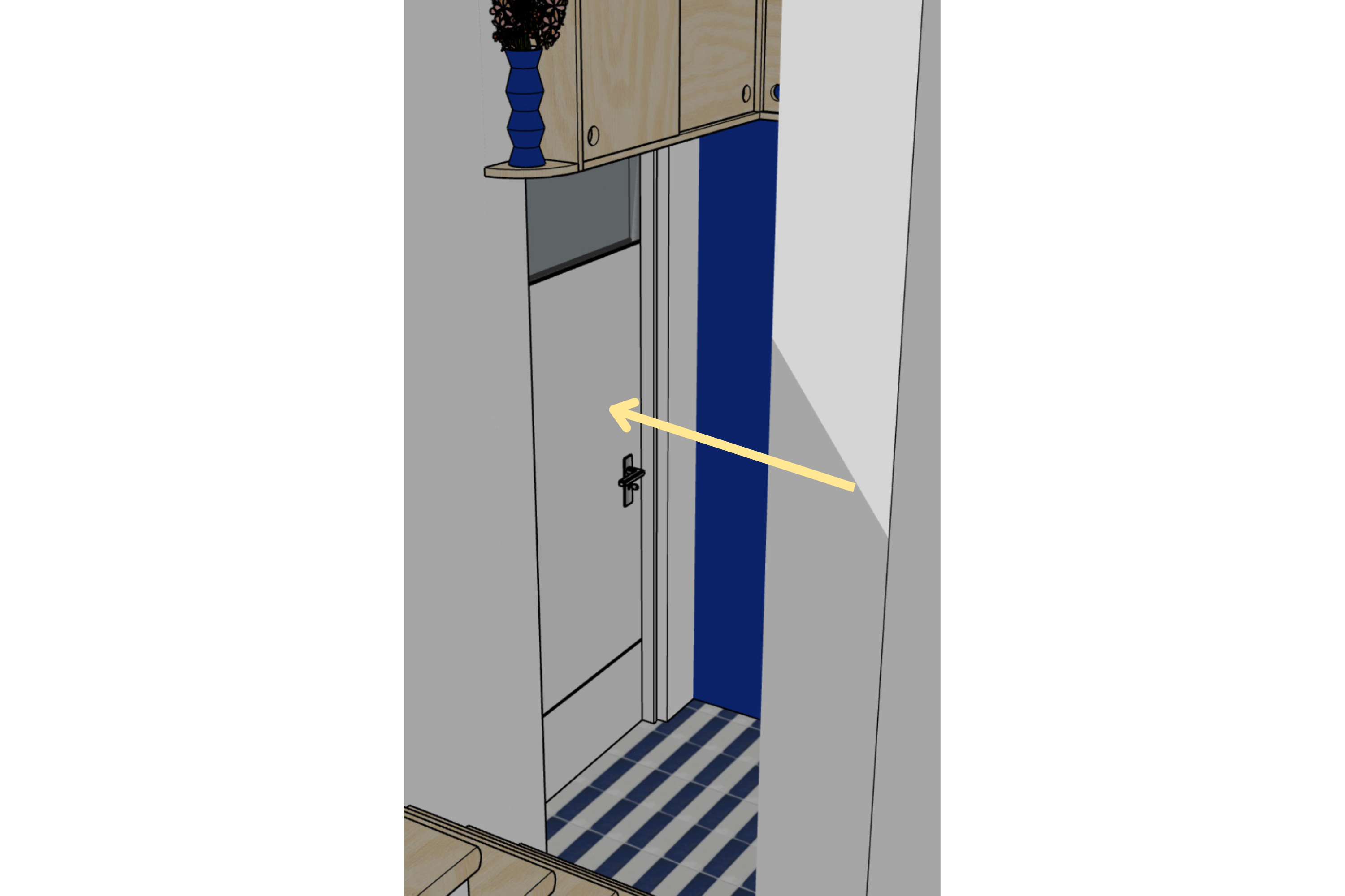 Le sol se pare de carrelage pour faciliter l’entretien, repris sur les contremarches pour étirer visuellement l’entrée. Le bleu a été choisi car il est déjà un fil conducteur de l’appartement.