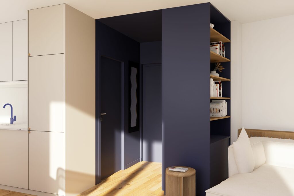 Murs et plafond de l’entrée sont peints dans une teinte bleu foncée qui permet de différencier cet espace du reste de l’appartement. Un ensemble de meuble prend place face à la porte, offrant des rangements bienvenus tout en donnant la sensation d’être dans une pièce à part entière.