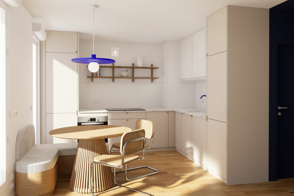 Côté cuisine, nous optons pour des façades beiges, au caractère intemporel, et un plan de travail blanc. Des poignées en chêne ainsi que des éléments bleu et vert d’eau apportent une note chaleureuse à l’ensemble. L’espace dédié à la prise des repas est quant à lui modulable. Une banquette dissimule des rangements.