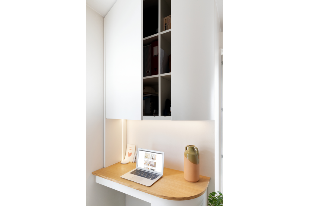 Le meuble associe un plateau en bois à une structure peinte en blanc mat, dans un esprit minimaliste et discret. Un éclairage par bande LED, intégré sous le placard suspendu, améliore le confort d’usage. Des étagères supplémentaires, dissimulées dans le pied du bureau, permettent d’optimiser le moindre centimètre.