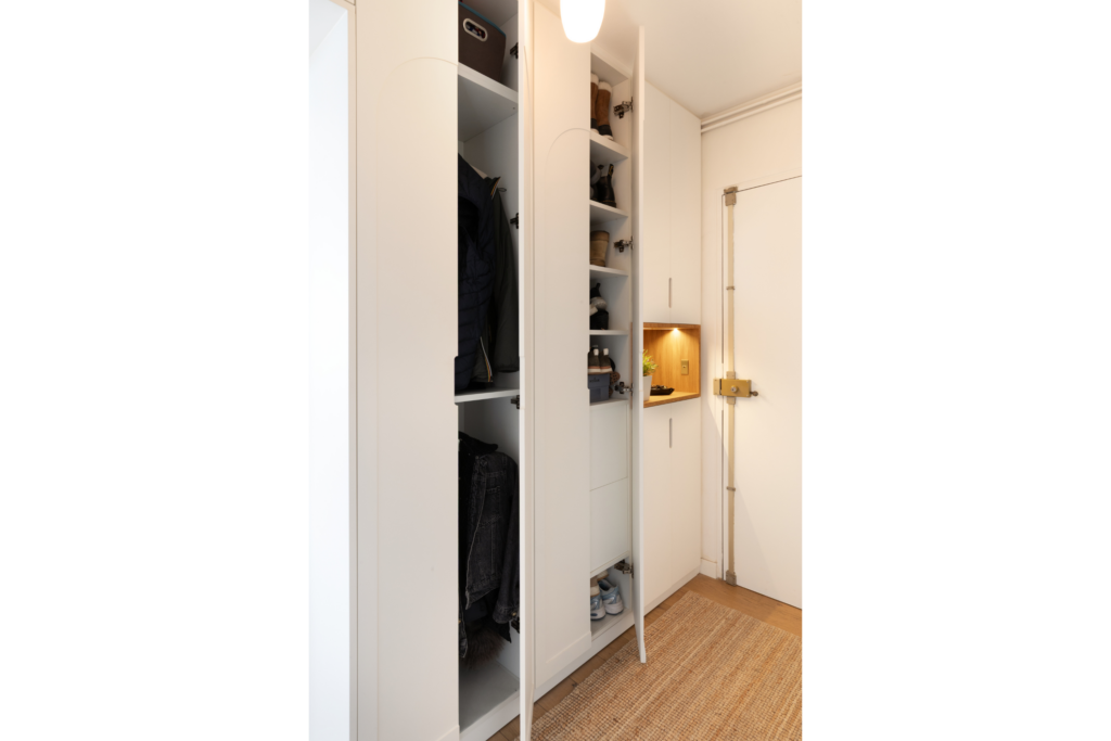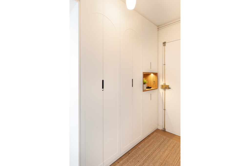 Les portes de placard se distinguent par des arches creusées, dessinées par Arnaud Bustarret pour adoucir les lignes et rendre l’entrée plus accueillante. Les poignées sont quant à elles intégrées pour plus d’ergonomie dans cet espace contraint. Les façades blanches du meuble sur mesure participent à la luminosité de l’espace, tandis que la niche en bois fait écho au parquet existant et apporte une touche chaleureuse.