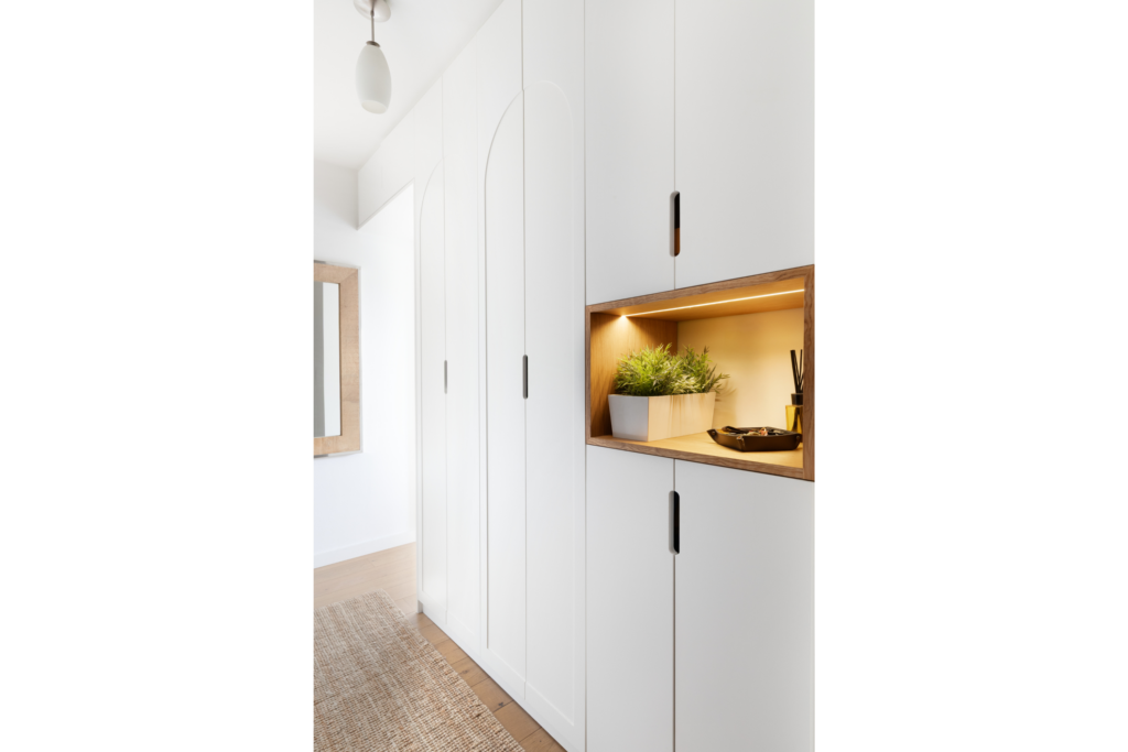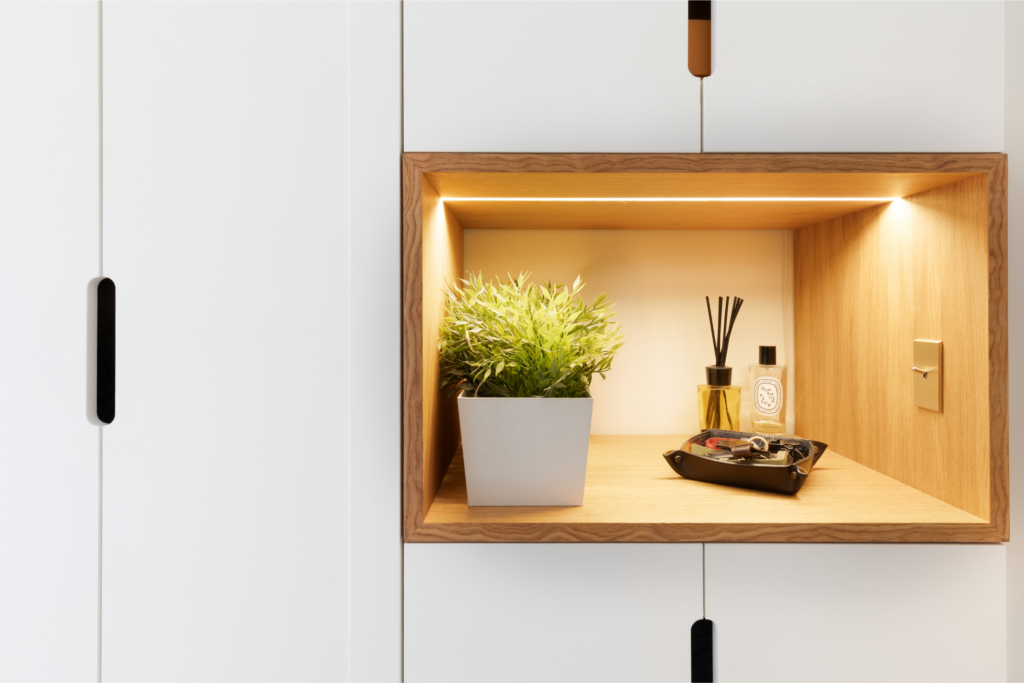 Traitée comme un véritable élément architectural, la niche en bois est mise en valeur par un éclairage LED intégré. Elle devient un point focal de l’entrée, à la fois pratique et décoratif, tout en renforçant la sensation de profondeur.