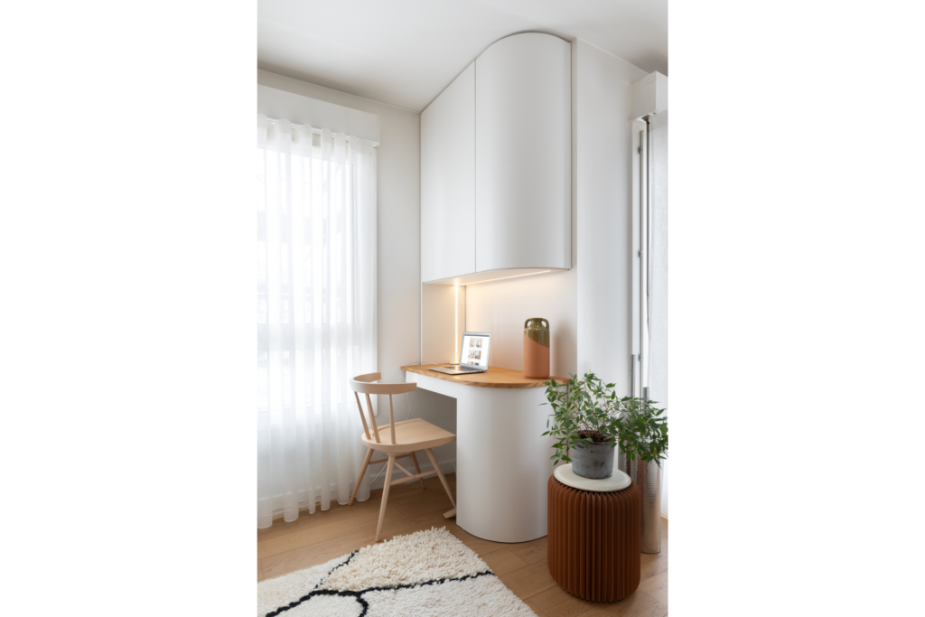 Dans le salon, la zone inexploitée située à côté de la fenêtre est transformé en coin télétravail. Le bureau sur mesure adopte des lignes simples et des formes arrondies, assurant une cohérence formelle avec les aménagements de l’entrée et une intégration douce dans la pièce de vie.