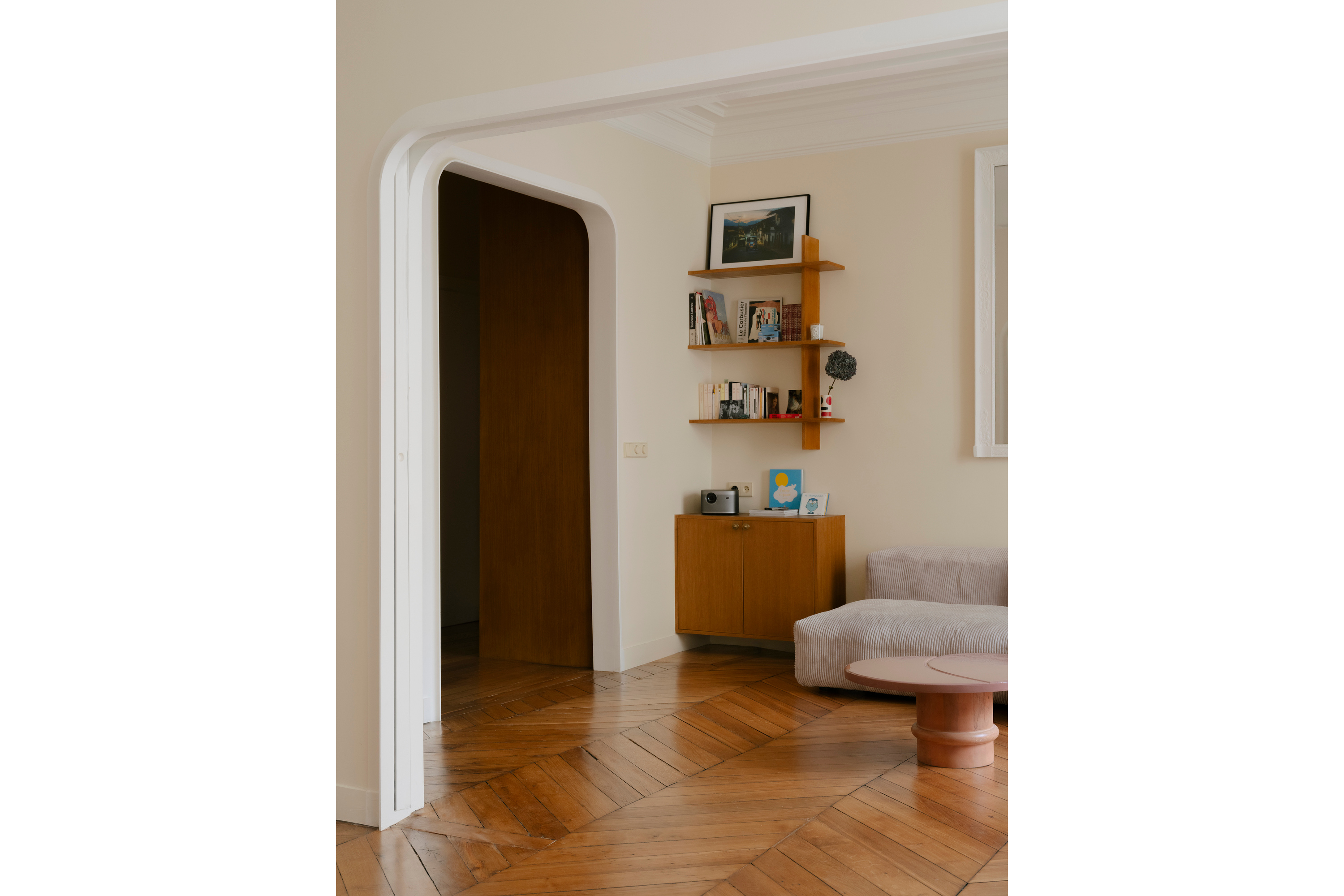 Après quelques mois de travaux, la jeune famille emménage avec joie dans son nouveau logement qui compte désormais deux chambres. Grâce à un sens aigu du détail et un travail subtil sur les circulations et les rangements, PS Studio a su créer un écrin confortable où l’âme haussmannienne dialogue avec une modernité discrète et maîtrisée.