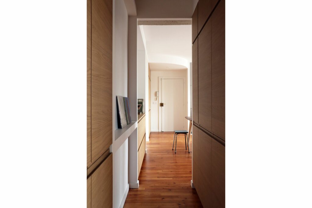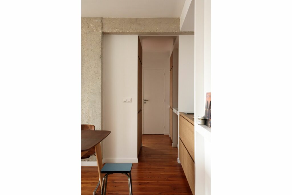 Une circulation principale est créée en fond d’appartement, accompagnée d’un linéaire continu de rangements, pensé comme un ruban fonctionnel : meuble technique dans l’entrée, meuble à vinyles dans le salon, dressing à proximité des chambres.