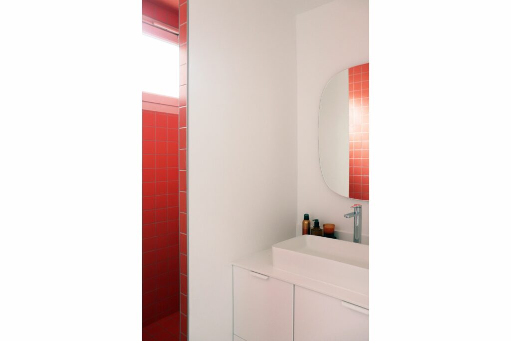 La salle d’eau a été entièrement réaménagée. La couleur rouge, fil conducteur du projet, s’y invite.