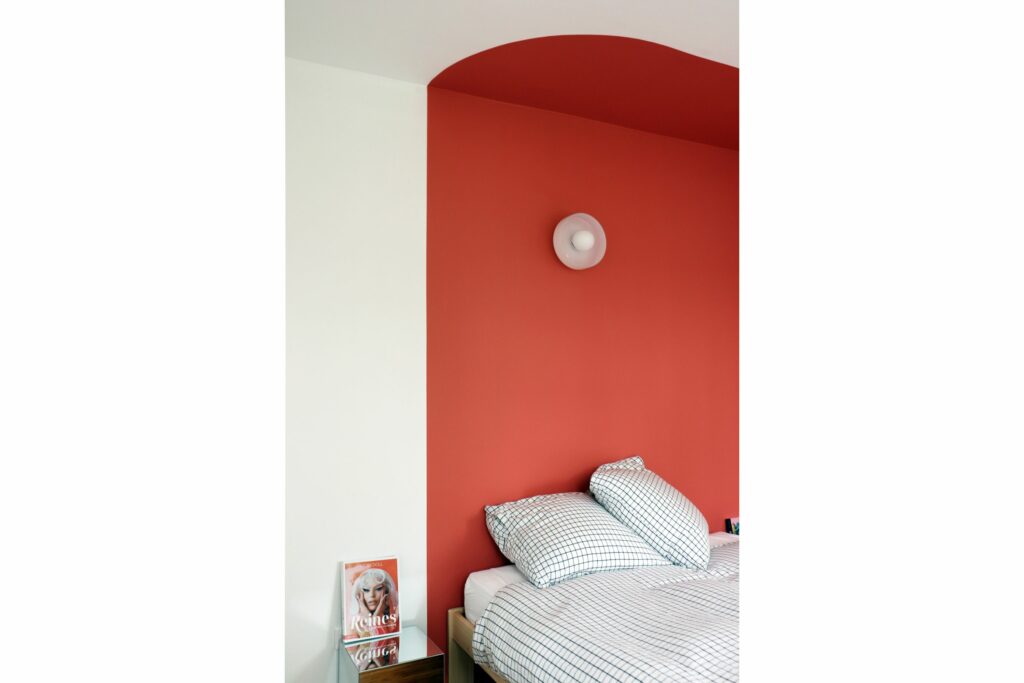 Les deux chambres ont été dépourvues de rangements afin de préserver une grande simplicité spatiale. Elles arborent toutefois une audacieuse teinte rouge, à l’instar de la salle d’eau !